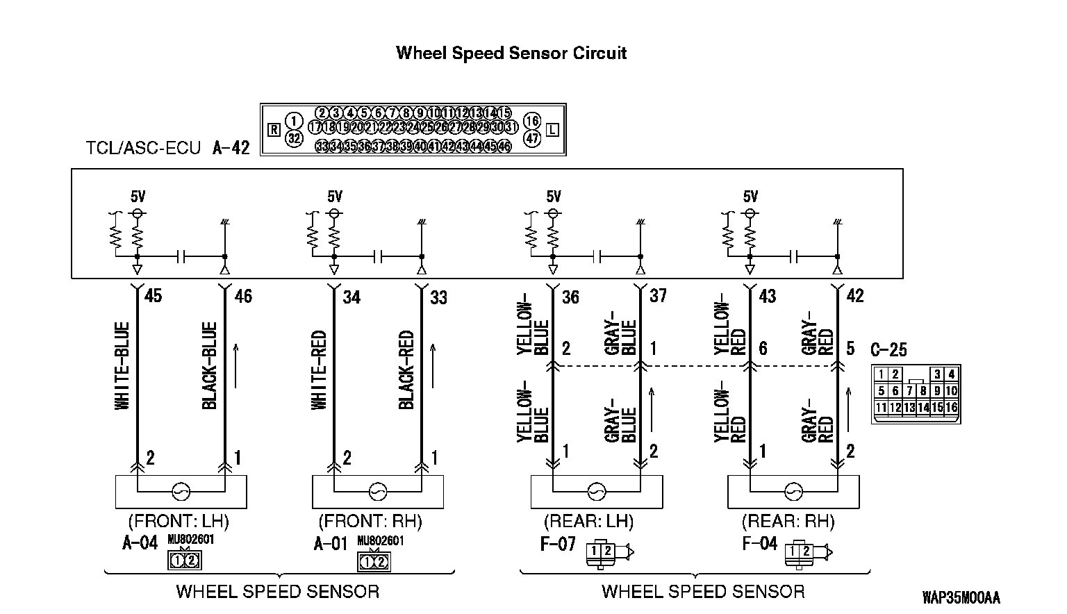 Q: Are TCL/ASC-ECU connector A42, intermediate connector C-25 and wheel speed sensor [rear: RH] connector F-04 damaged?