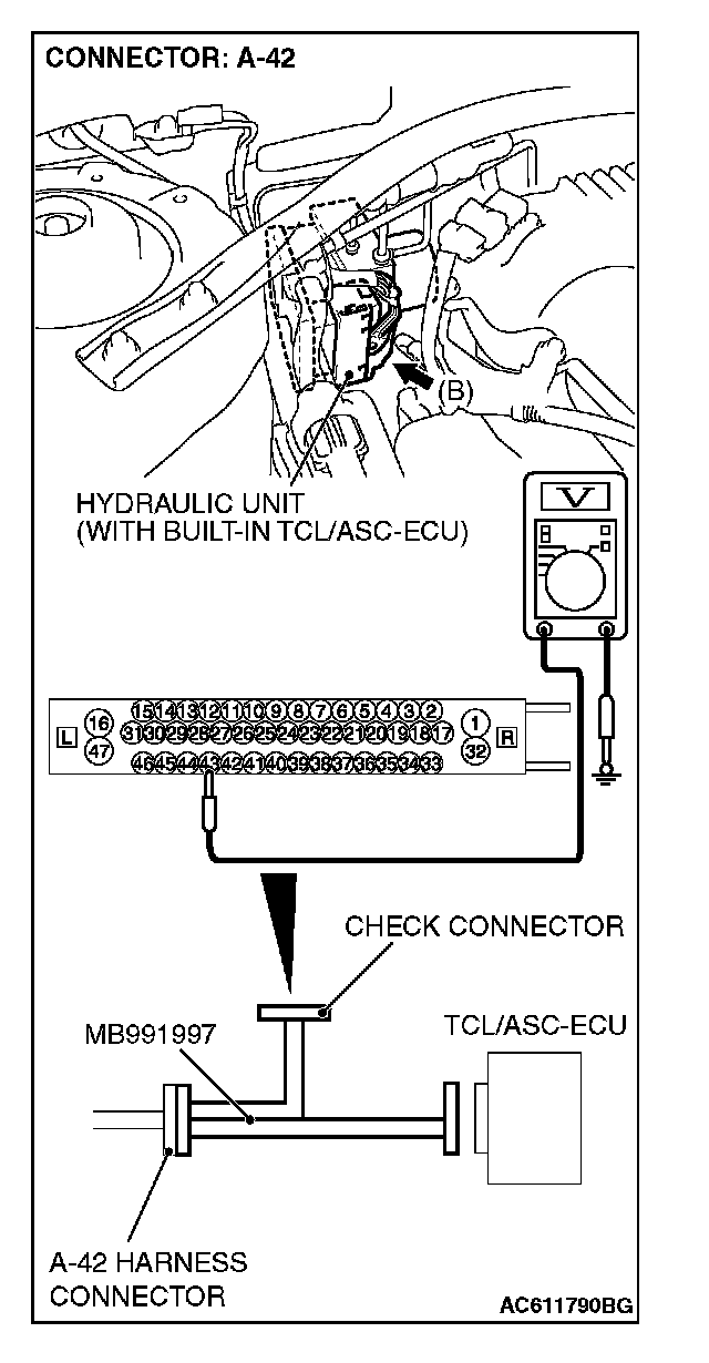 STEP 8. Measure the voltage at TCL/ASC-ECU connector A-42.