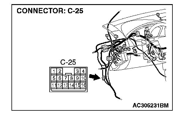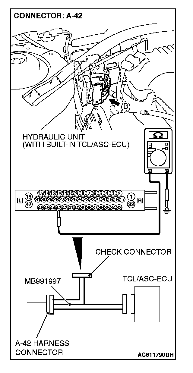 1) Disconnect the connector A-42, and connect special tool MB991997 to the wiring harness-side connector.