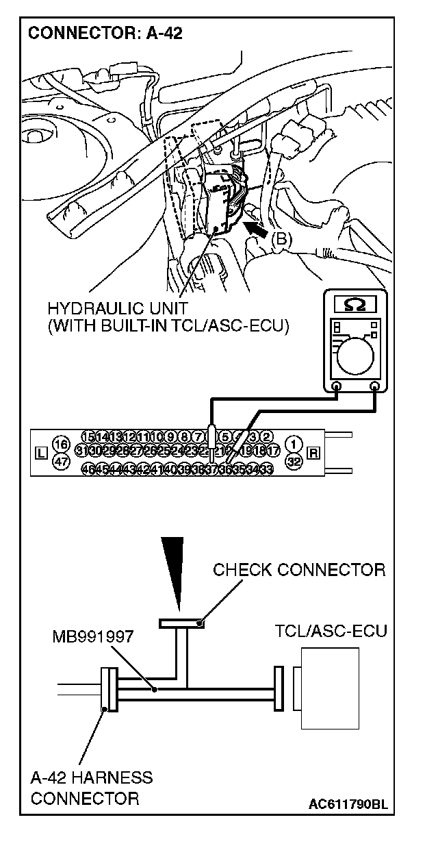 1) Disconnect the connector A-42, and connect special tool MB991997 to the wiring harness-side connector.