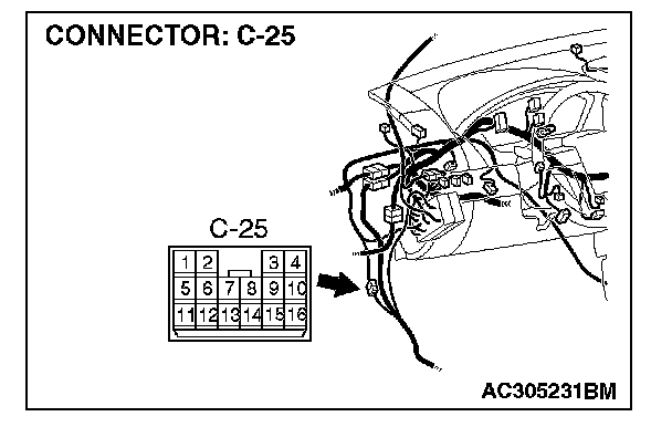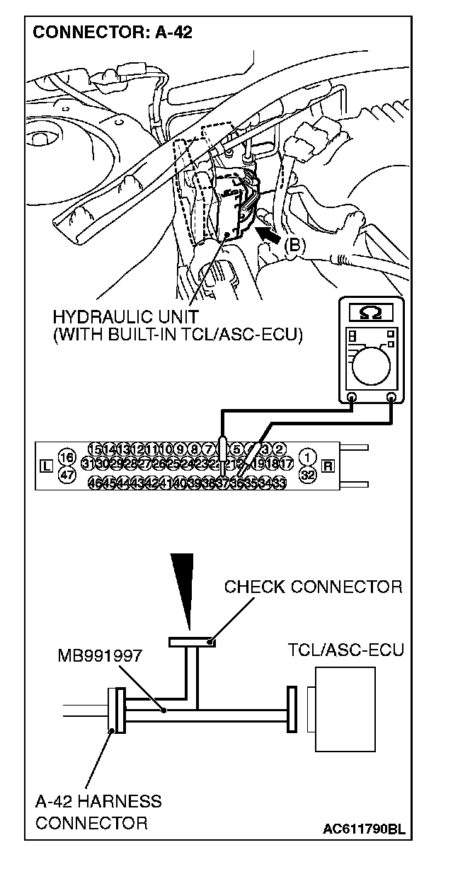 1) Disconnect the connector A-42, and connect special tool MB991997 to the wiring harness-side connector.