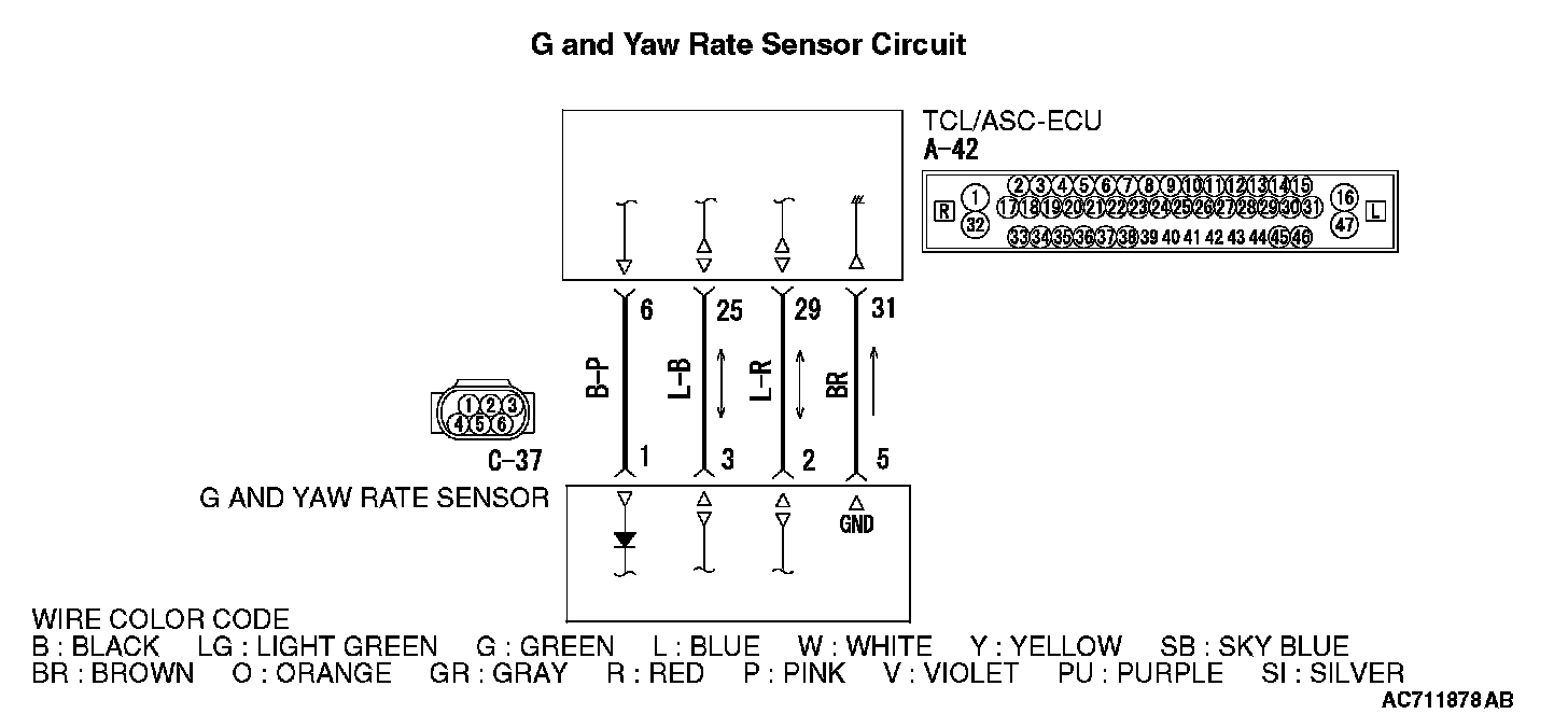 YES: Open circuit may be present in the G and yaw rate sensor power supply lines. Repair the wiring harness between TCL/ASC-ECU connector A-42 (terminal 6) and G and yaw rate sensor connector C-37 (terminal 1). Then go to Step 14.