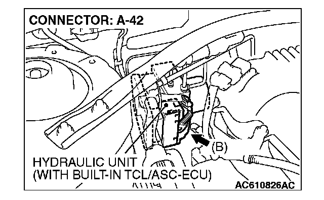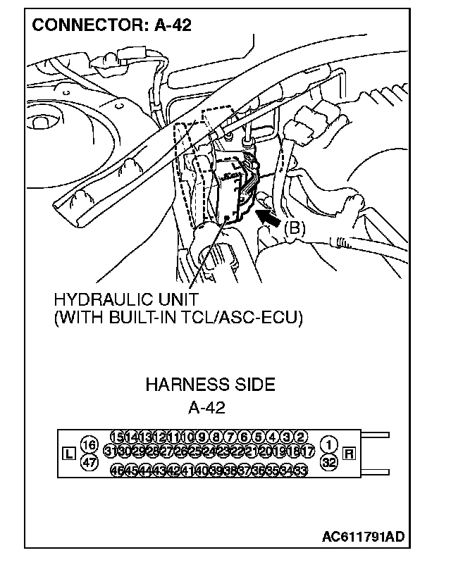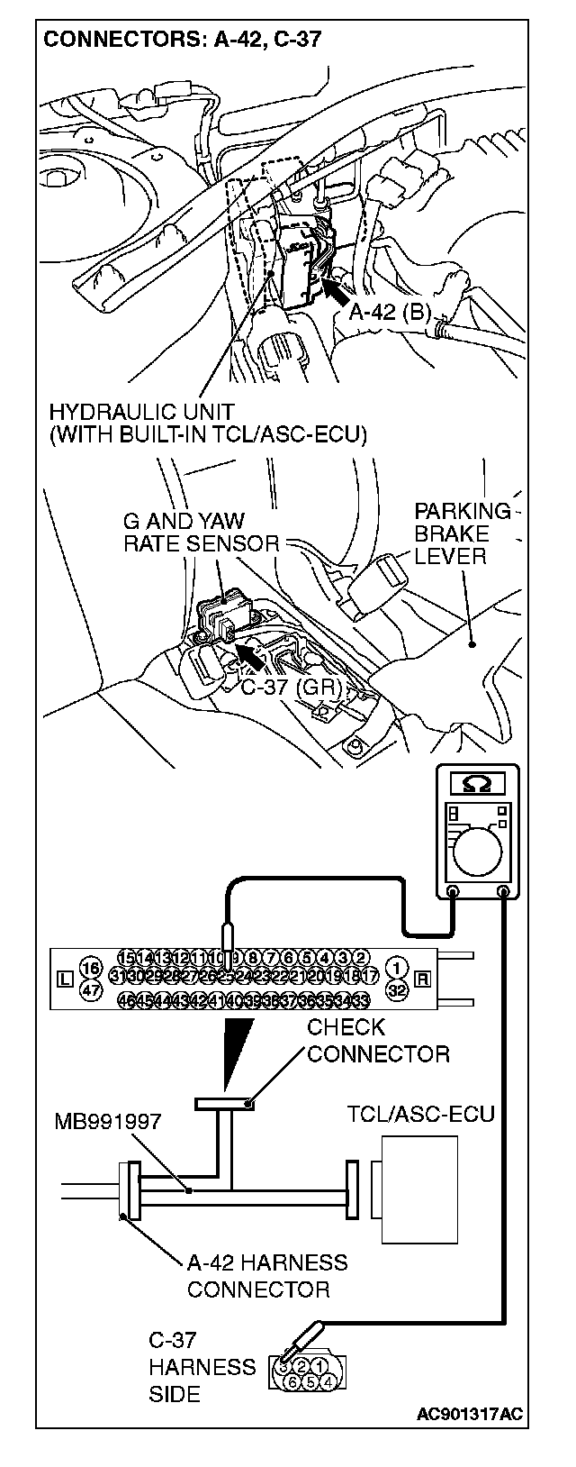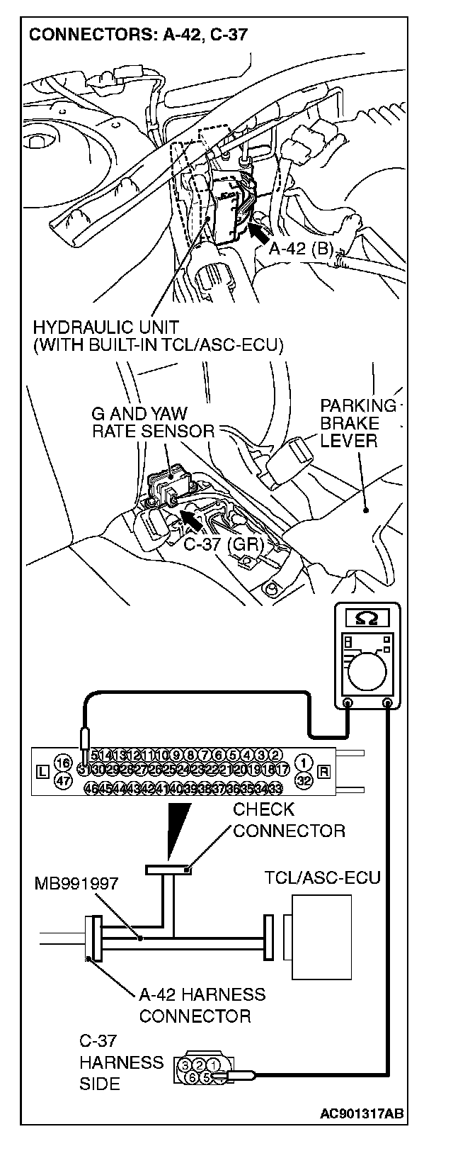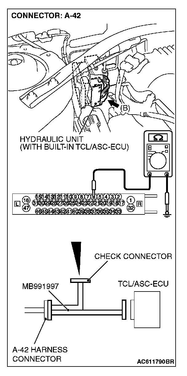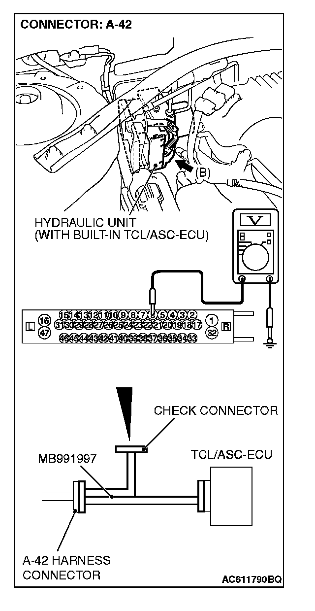 1) Disconnect the connector A-42, and connect special tool MB991997 to the wiring harness-side connector and TCL/ASC-ECU side.
