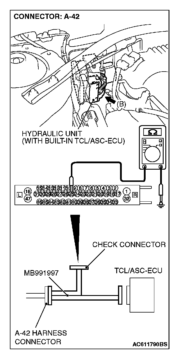 1) Disconnect the TCL/ASC-ECU connector A-42, and connect special tool MB991997 to the wiring harness-side connector.