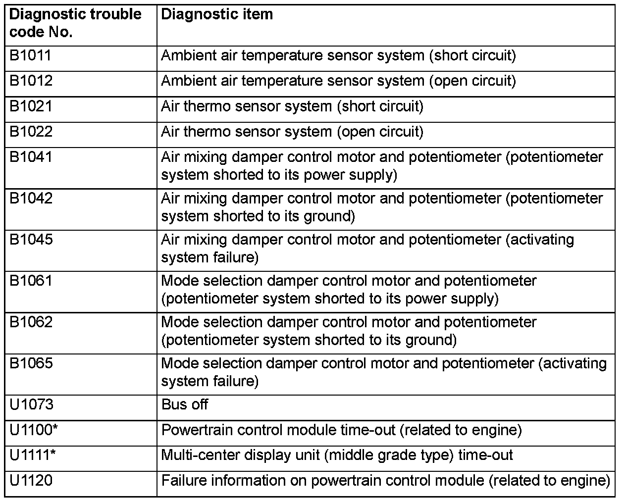 NOTE: *: When the DTC relating to the CAN communication error are output, make sure of the vehicle equipment. When the vehicle is not equipped with the system the A/C-ECU communicates to, the DTC is always output. This is not abnormal.