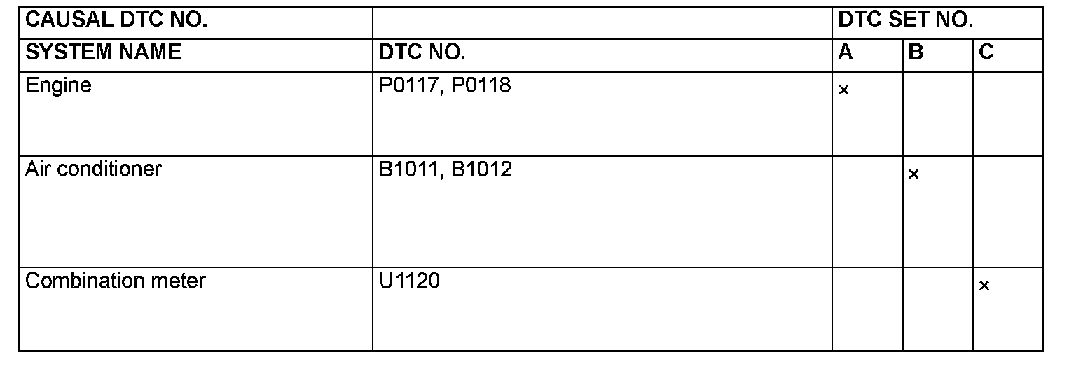 INTERSYSTEM AFFILIATED DTC REFERENCE TABLEFor vehicles with CAN, when DTC which influences the transmission data is set to the ECU which sends the data, DTC also could be set to the ECU which receives and controls the transmission data. The table below shows the relativity of DTC between ECUs. In addition, the alphabet shows the following DTC.