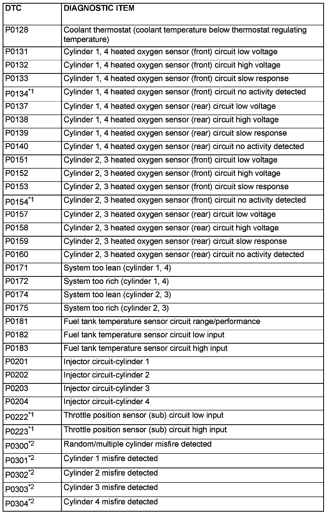 - The codes marked with a "*2" in the diagnosis code number column have the following two conditions for recording the diagnostic trouble code.