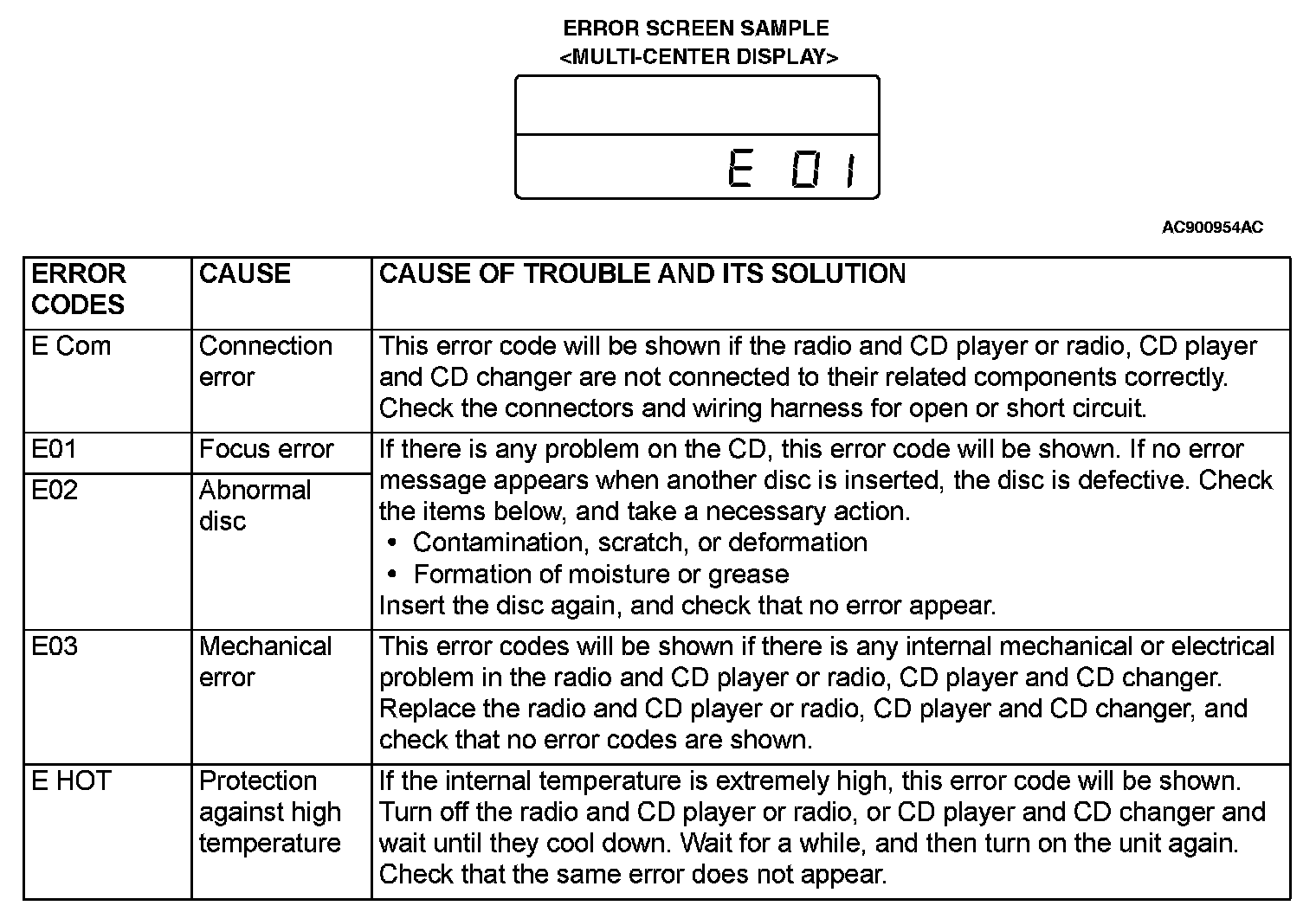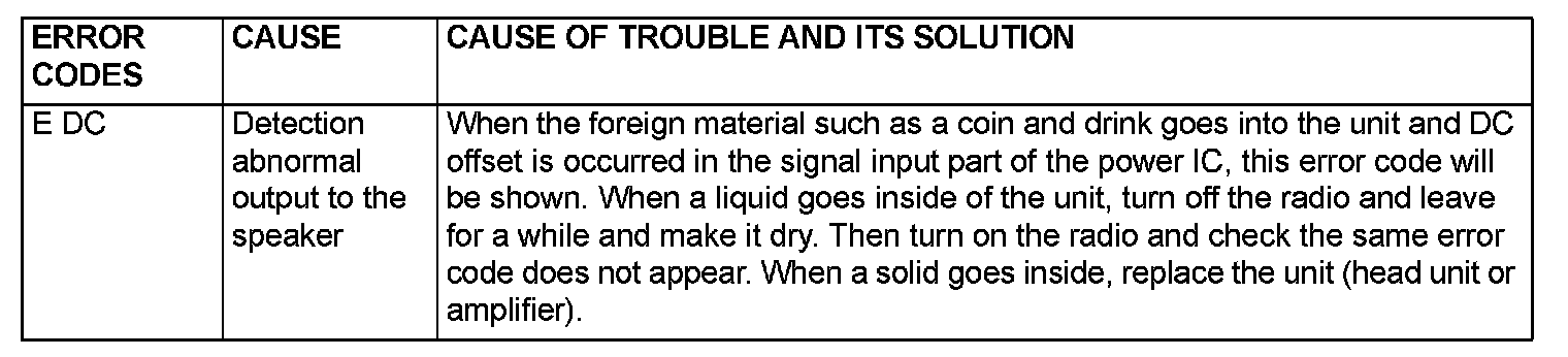 AUDIO ERROR CODESIf the radio and CD player or radio, CD player and CD changer detects any malfunction in itself or the inserted CD, the error codes below will be shown on the multi-center display.