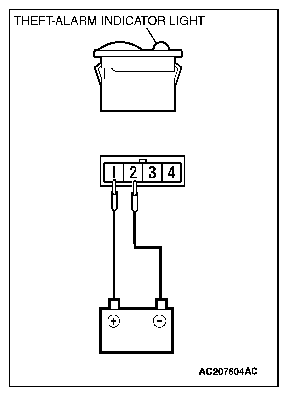 Connect the positive battery terminal to theft-alarm indicator light terminal No.1, and connect the negative battery terminal to theft-alarm indicator light terminal No.2. Then, confirm that the theft-alarm indicator light illuminates.