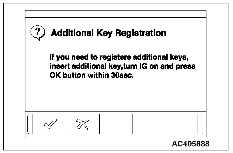 9. When the ignition key registration is finished, the additional key registration menu is displayed. To register the additional key, insert the key and turn the ignition switch to the "ON" position. Then, press the OK button. Press the CANCEL button to terminate the ignition key registration.