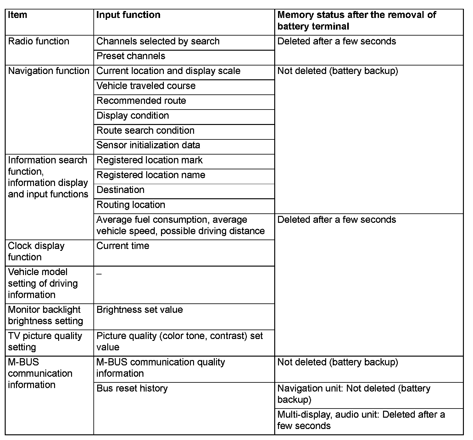 MMCS stores a large volume of information which is input at the discretion of customers. The memory of each information becomes as follows when the battery terminal is removed. Therefore, before removing the battery, the recording of preset channels is necessary. Depending on the time period of battery removal, the current location, destination, and others of the navigation function must be recorded.