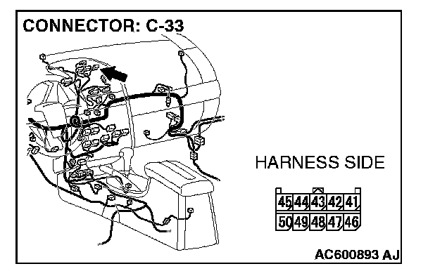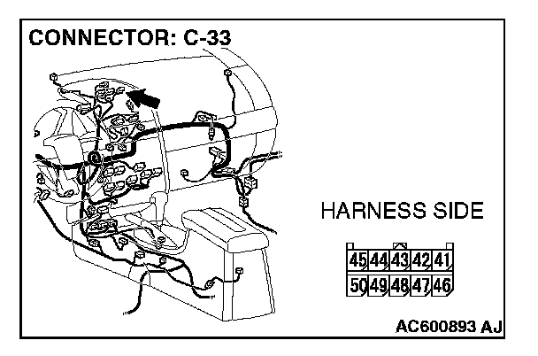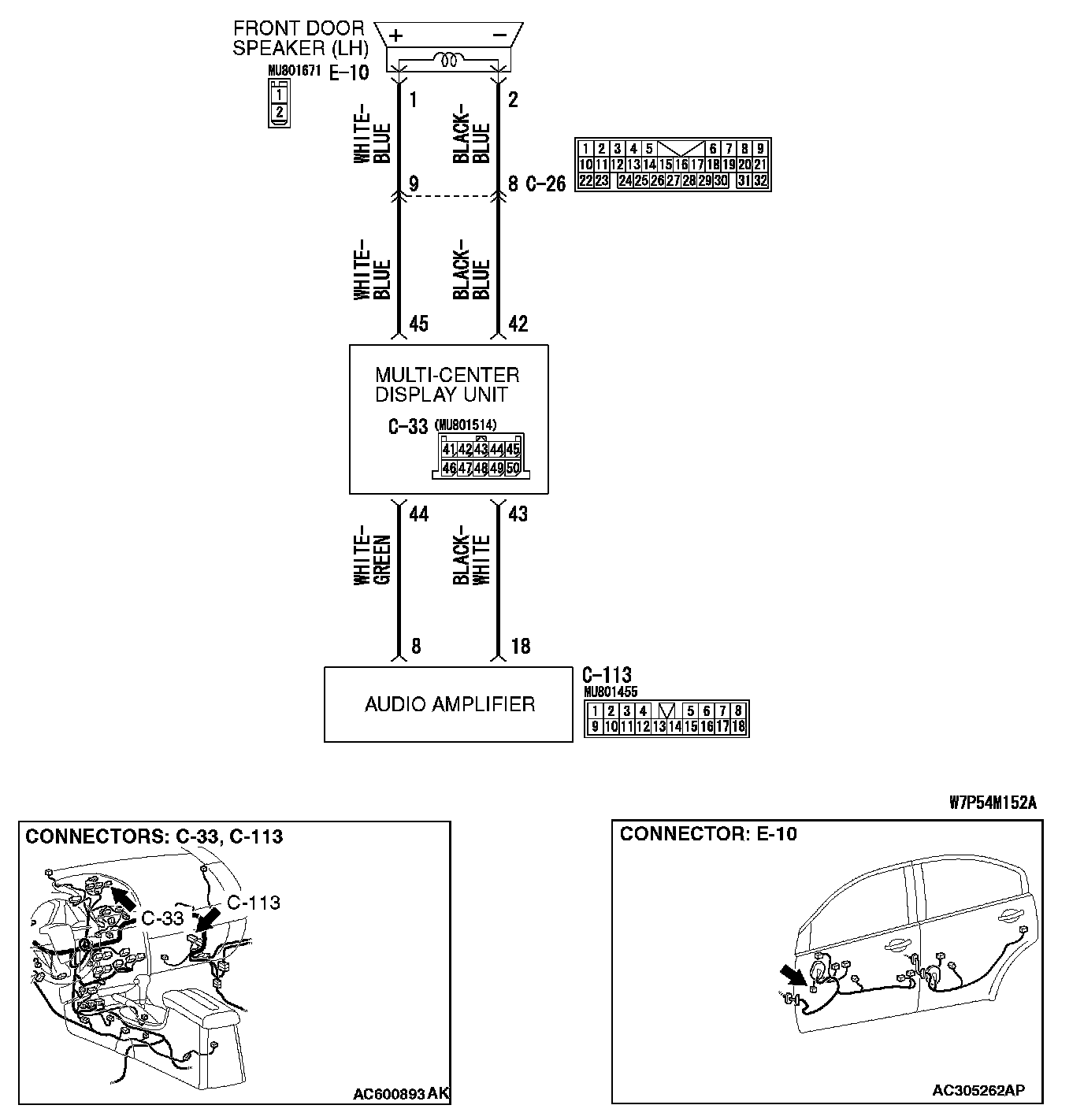 STEP 3. Check the wiring harness between front door speaker (LH) connector E-10 (terminals 1 and 2) and multi-center display connector C-33 (terminals 45 and 42).