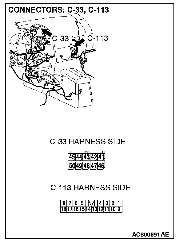 STEP 5. Check the wiring harness between multi-center display connector C-33 (terminals 44 and 43) and audio amplifier connector C-113 (terminals 8 and 18).