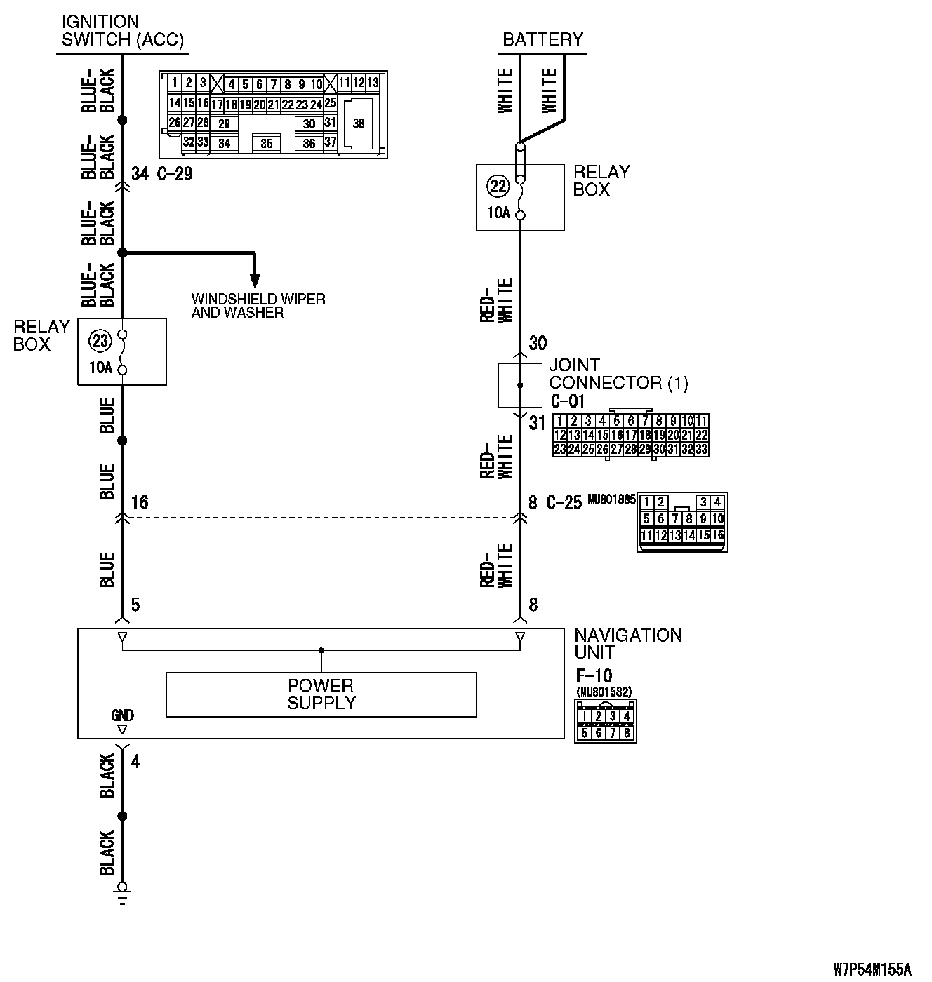 STEP 7. Check the wiring harness between navigation unit connector F-10 (terminal 5) and ignition switch (ACC).