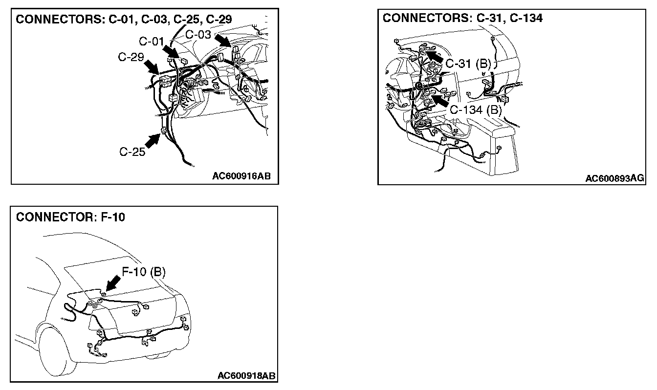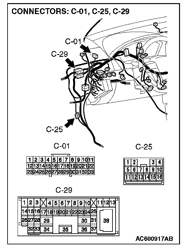 NOTE: Also check intermediate connector C-29, C-25 and joint connector C-01 for loose, corroded, or damaged terminals, or terminals pushed back in the connector. If intermediate connector C-29, C-25 and joint connector C-01 are damaged, repair or replace the damaged component(s).