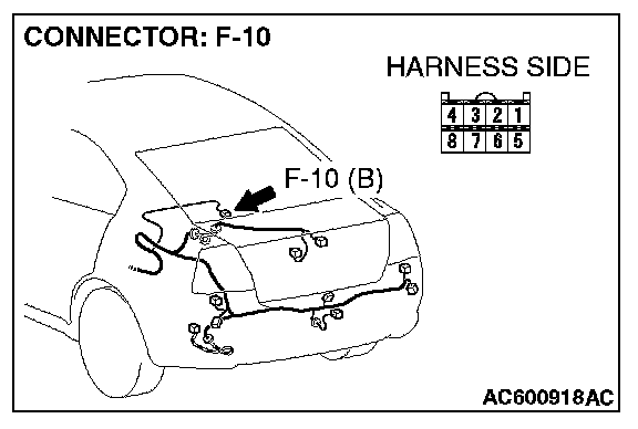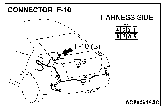 1. Disconnect navigation unit connector F-10 and measure the resistance available at the wiring harness side of the connector.