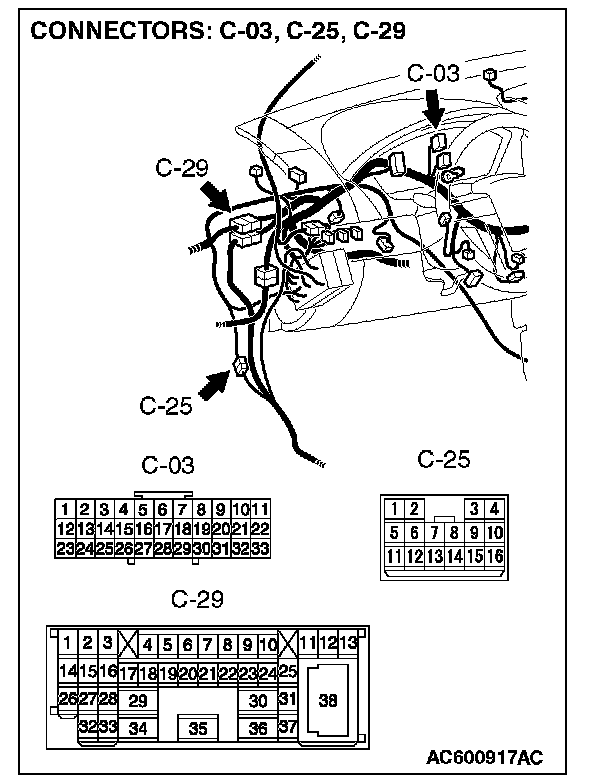 NOTE: Also check intermediate connector C-29, C-25 and joint connector C-03 for loose, corroded, or damaged terminals, or terminals pushed back in the connector. If intermediate connector C-29, C-25 and joint connector C-03 are damaged, repair or replace the damaged component(s).