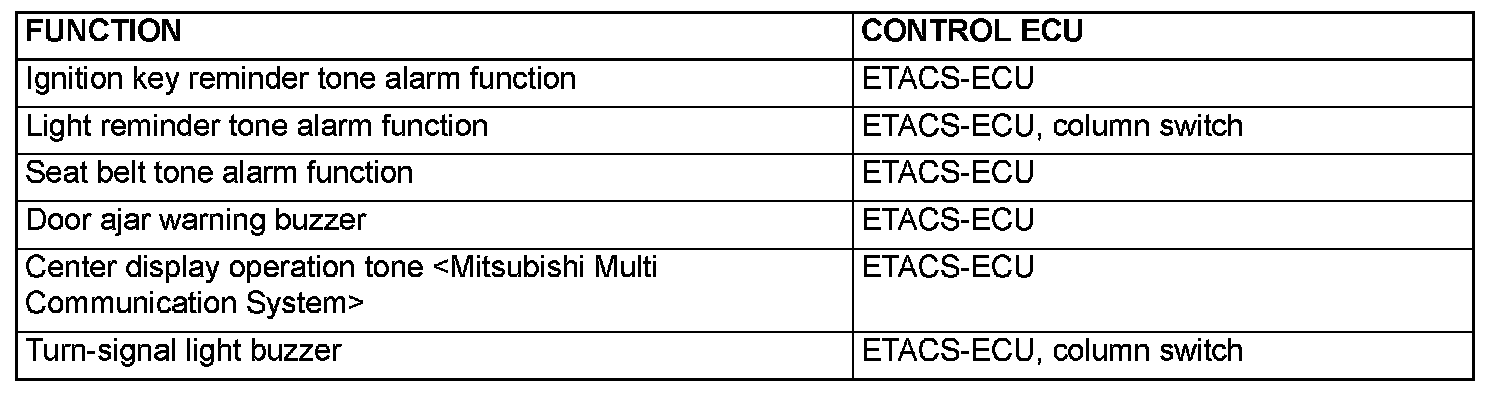 The tone alarm functions are as follows. These functions are controlled by relevant ECUs.