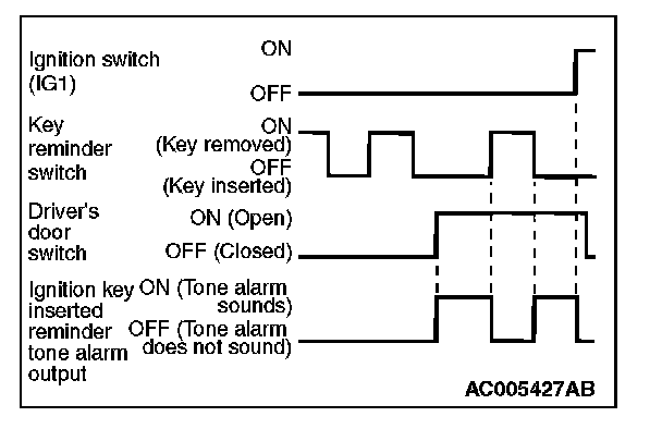 When the driver's door is opened with the ignition key inserted in the ignition key cylinder (ignition switch is in the OFF position,) the tone alarm sounds intermittently to indicate that the ignition key has not been removed.