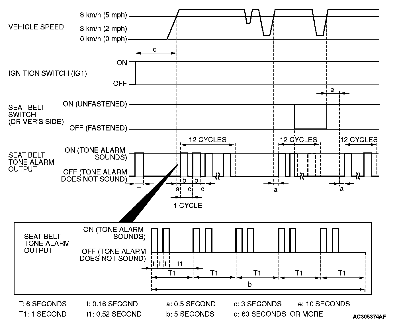 - Sounds the tone alarm 12 cycles (after 0.5 second) if any of the following conditions is met when sixty seconds or more have elapsed since the ignition switch is turned "ON." One cycle consists of five-second "on" and then three-second "off."