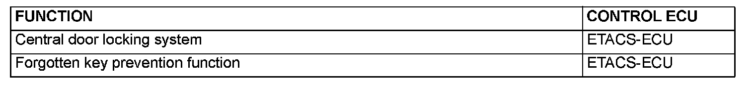 After unlocking the doors with the keyless entry transmitter, if no doors are opened, if the ignition key is not inserted or if the locking function is not operated, the ETACS-ECU automatically locks the doors in 30 seconds.