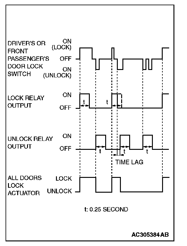 When the door is locked and unlocked by driver's or front passenger's door lock switch consecutively, the ETACS-ECU operates its door lock relay and passes a current through the door lock actuators of all doors for 0.25 second to lock all doors. Then, the ETACS-ECU operates its door unlock relay and passes a current through the door lock actuators of all doors for 0.25 second to unlock all doors. Due to this, there may be a time lag between the driver's or front passenger's door lock switch actuation and the time when all doors are unlocked.