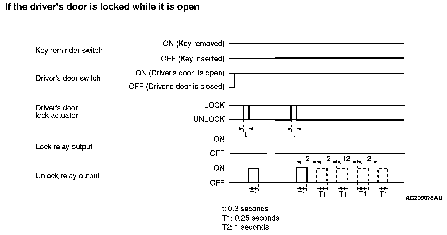 If the driver's door is locked while it is open and when the key is still in the ignition key cylinder, approximately 0.3 second later the ETACS-ECU activates the unlock relay output for 0.25 second to prevent the door from being locked with the key inside the vehicle.