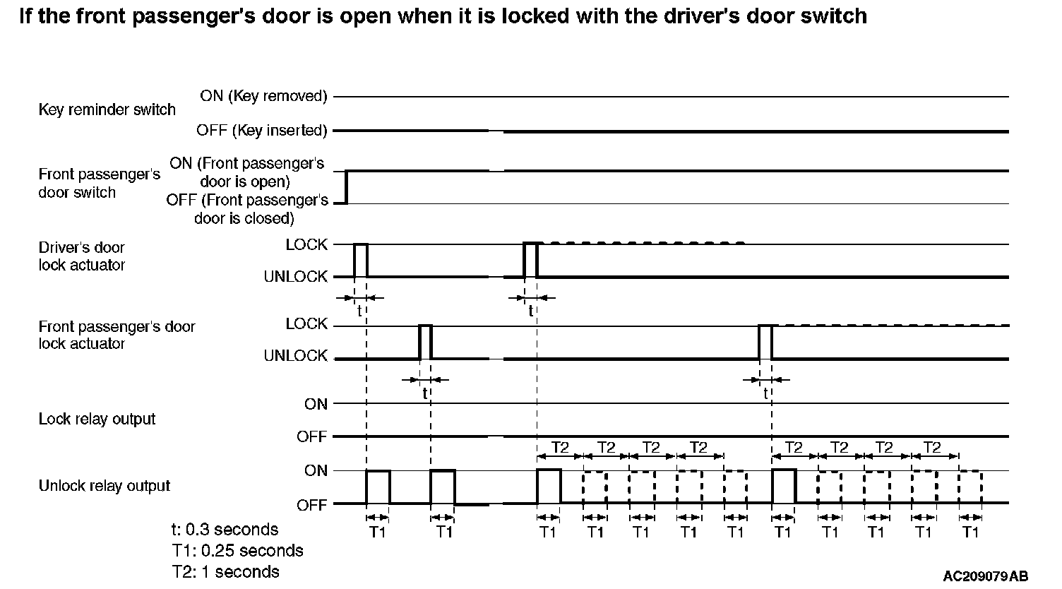 If the passenger's door or driver's door are locked while the passenger's door is open and when the key is still in the ignition key cylinder, approximately 0.3 second later the ETACS-ECU activates the unlock relay output for 0.25 second to prevent the door from being locked with the key inside the vehicle.