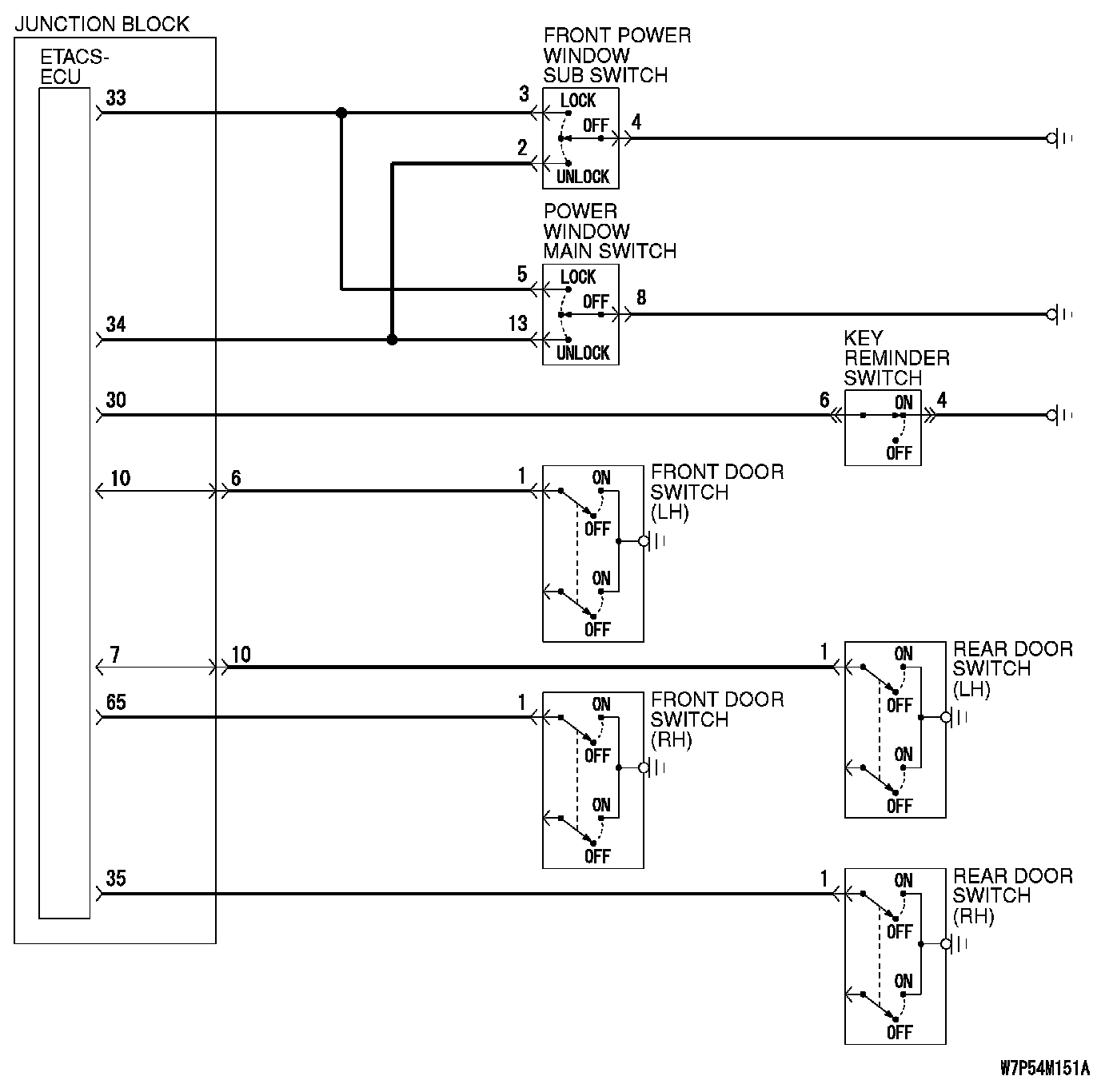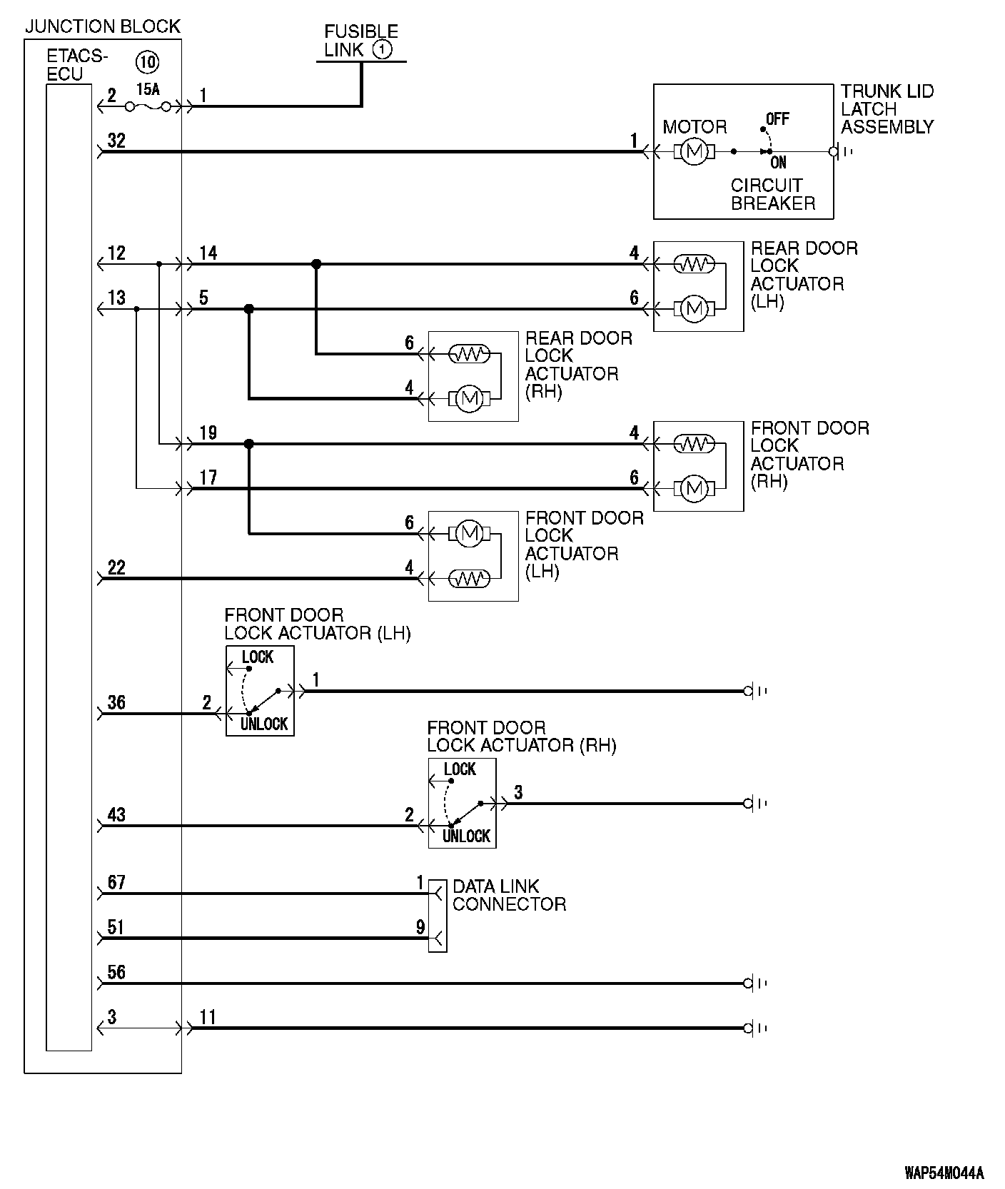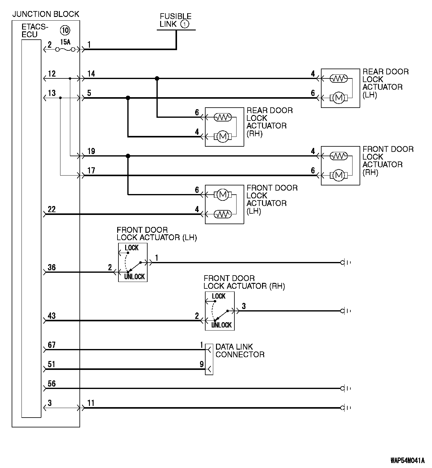 When the door is unlocked by the driver's or front passenger's door lock switch, the ETACS-ECU operates its door unlock relay and passes a current through the door lock actuators of all doors for 0.25 second to unlock all doors.