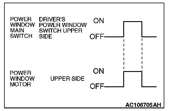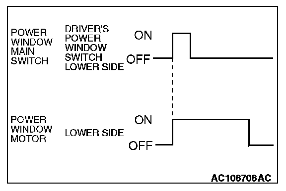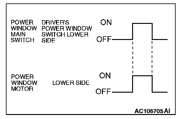 When the driver's power window switch on the power window main switch is pushed down fully, the system energizes its respective power window motor, and then the driver's window glass moves to its lowest position.
