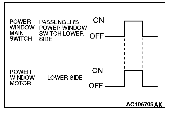 When the passenger's power window switch on the power window main switch is pushed down, the system energizes its respective power window motor, and then the passenger's window glass lowers.