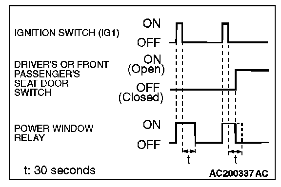 Even after the ignition is switched off, the ETACS-ECU keeps the power window relay activated for approximately 30 seconds, enabling raising and lowering of the power windows by using the power window switches. After approximately 30 seconds, the power window relay is deactivated. During this timed operation, if the driver or passenger doors are opened, the power window relay is deactivated from that moment.
