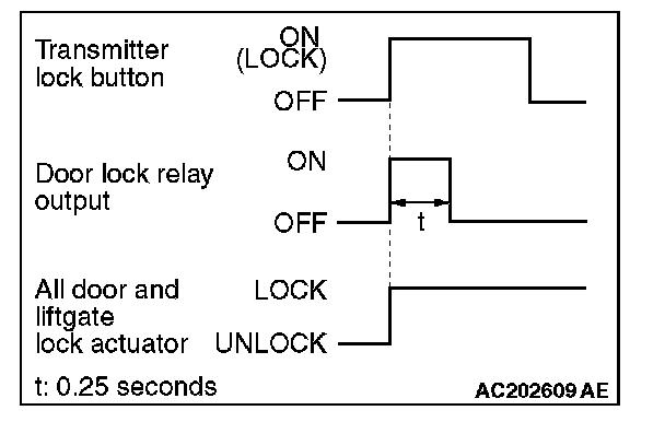 When the transmitter lock button is pressed, the ETACS-ECU energizes its door lock relay to operate all the door lock actuators for 0.25 second, locking all doors.
