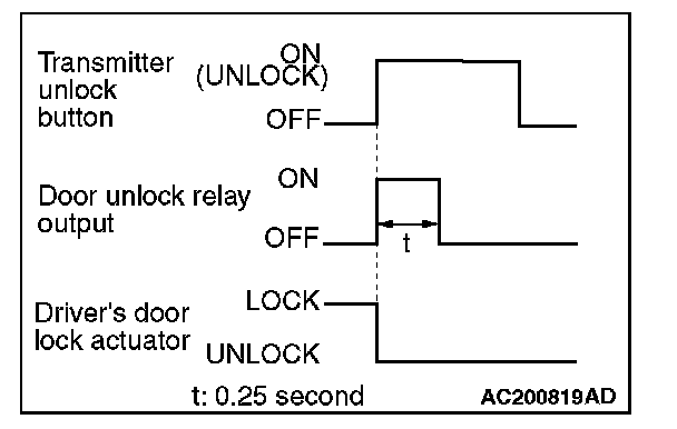 When the transmitter unlock button is pressed once, the ETACS-ECU energizes its door unlock relay to operate the door lock actuator of the driver's door for 0.25 second, thus unlocking only the driver's door.