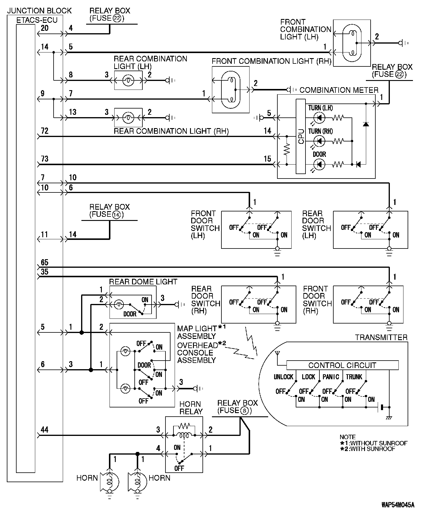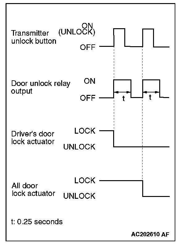 When the transmitter unlock button is pressed twice, the ETACS-ECU energizes its door unlock relay to operate the driver's door lock actuator and the other door lock actuators for 0.25 second each in succession. All the doors will be unlocked.