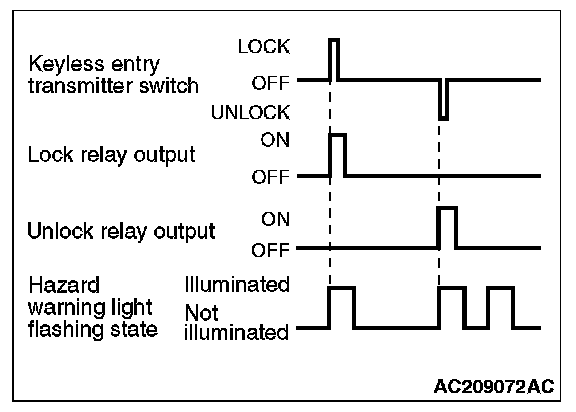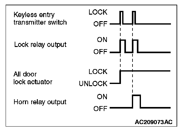 If the keyless entry transmitter is used to send a lock signal to the ETACS-ECU, the first signal locks all doors while the second signal sounds the horn once.