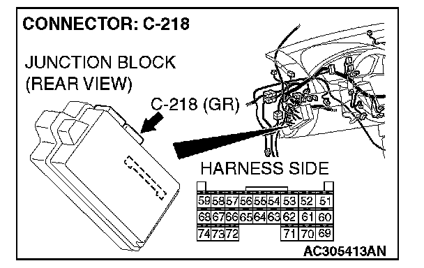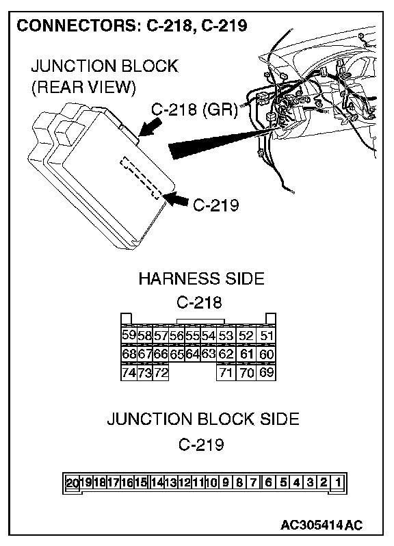 1. Disconnect ETACS-ECU connectors C-218 and C-219, and measure the resistance available at the junction block side of the connector.