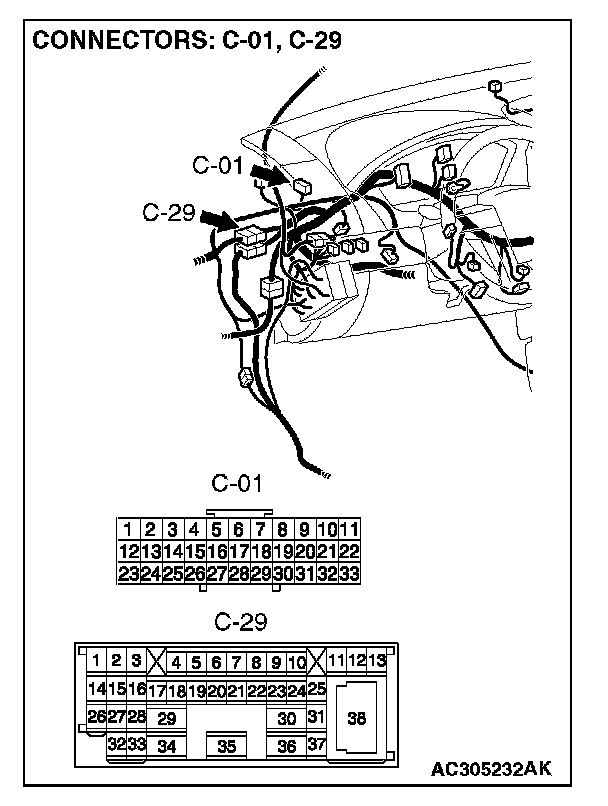 NOTE: Also check intermediate connector C-29 and joint connector C-01 for loose, corroded, or damaged terminals, or terminals pushed back in the connector. If intermediate connector C-29 or joint connector C-01 is damaged, repair or replace the connector.