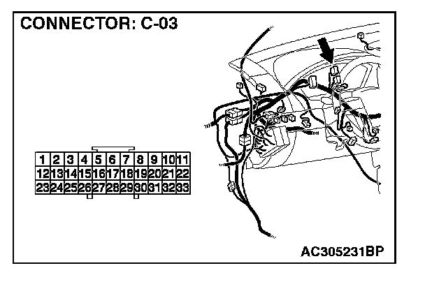 NOTE: Also check joint connector C-03 for loose, corroded, or damaged terminals, or terminals pushed back in the connector. If joint connector C-03 is damaged, repair or replace the connector.