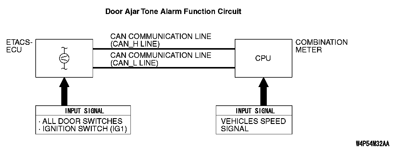 If the door-ajar warning tone alarm does not work, connector(s), wiring harness in the CAN bus lines, the combination meter, the ETACS-ECU or the input signal circuit may be defective.
