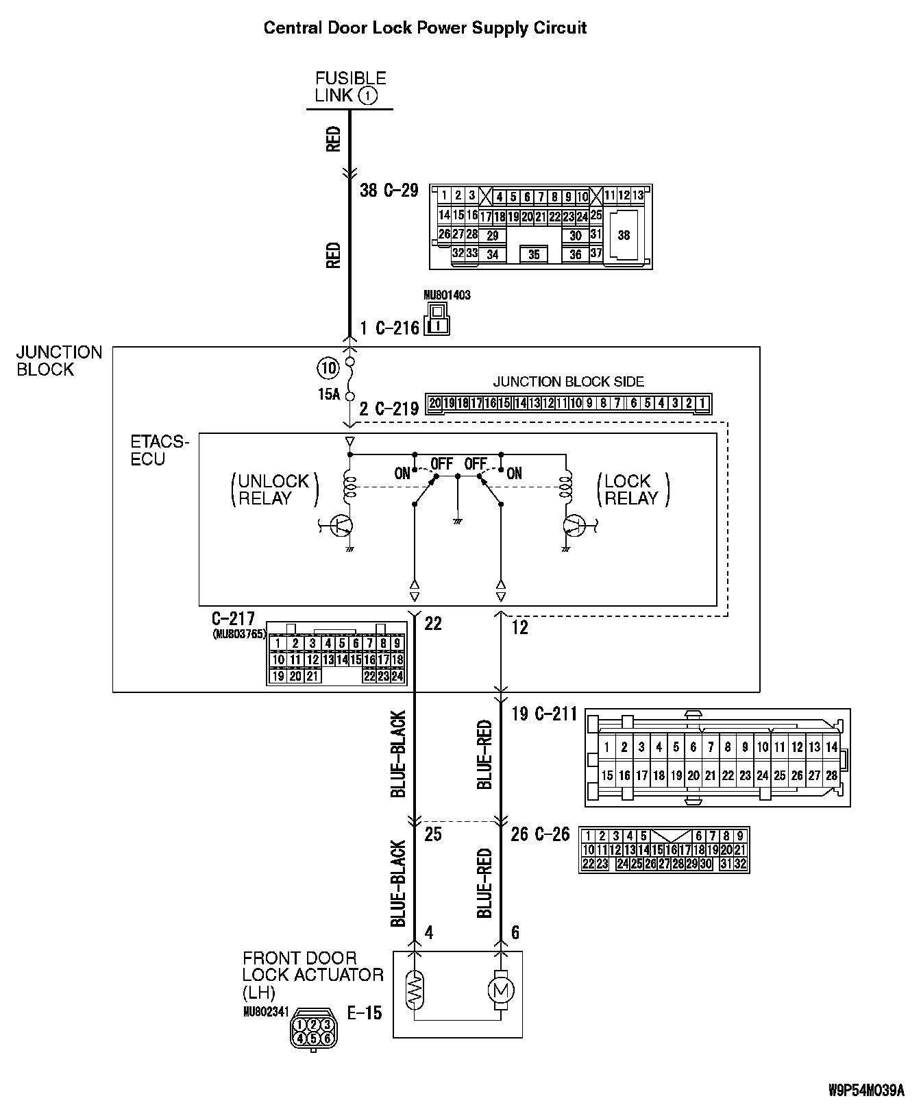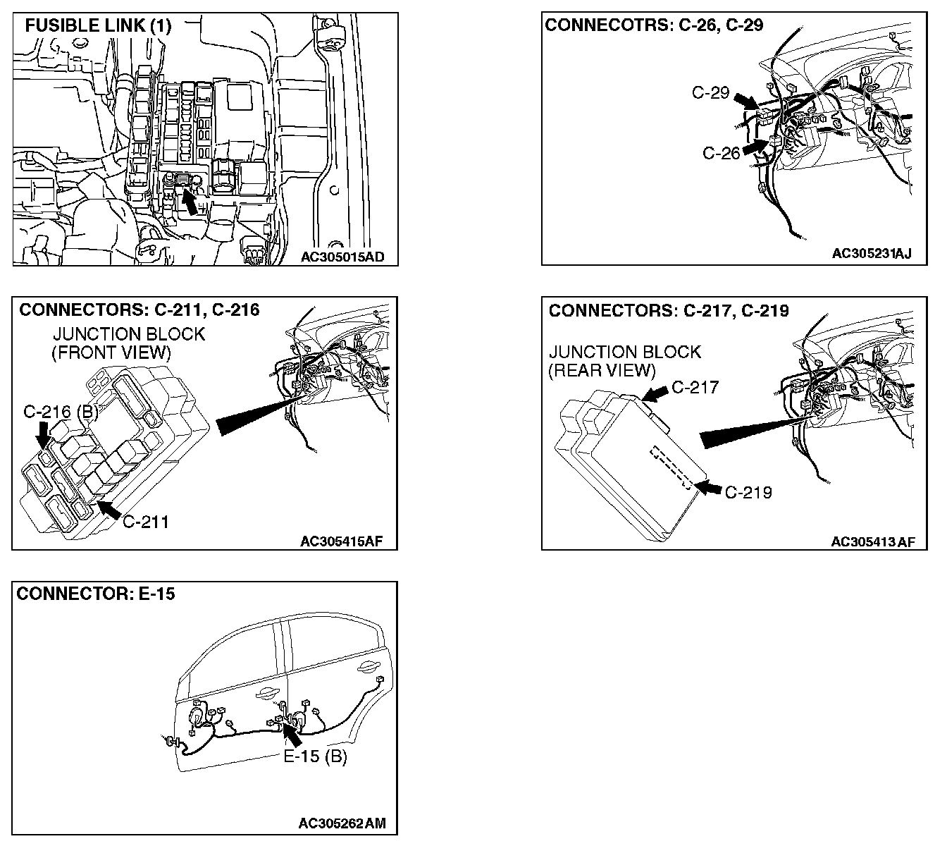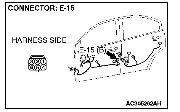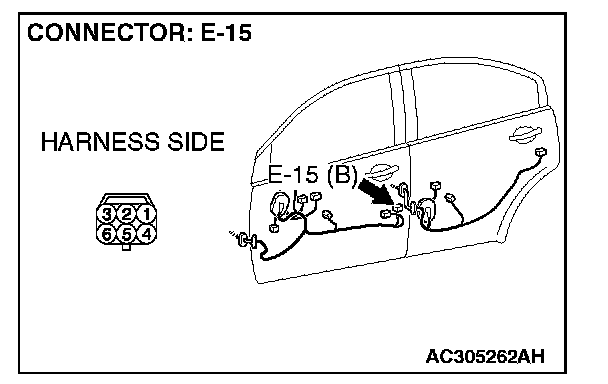 STEP 5. Check ETACS-ECU connectors C-217 and front door lock actuator (LH) connector E-15 for loose, corroded or damaged terminals, or terminals pushed back in the connector.
