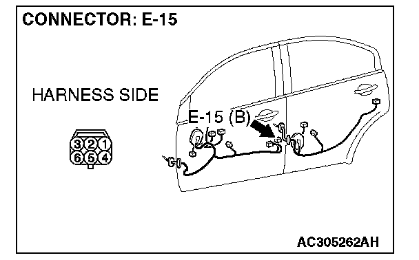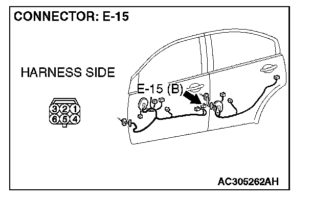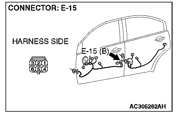 STEP 2. Check front door lock actuator (LH) connector E-15 for loose, corroded or damaged terminals, or terminals pushed back in the connector.