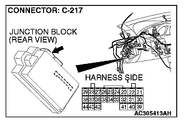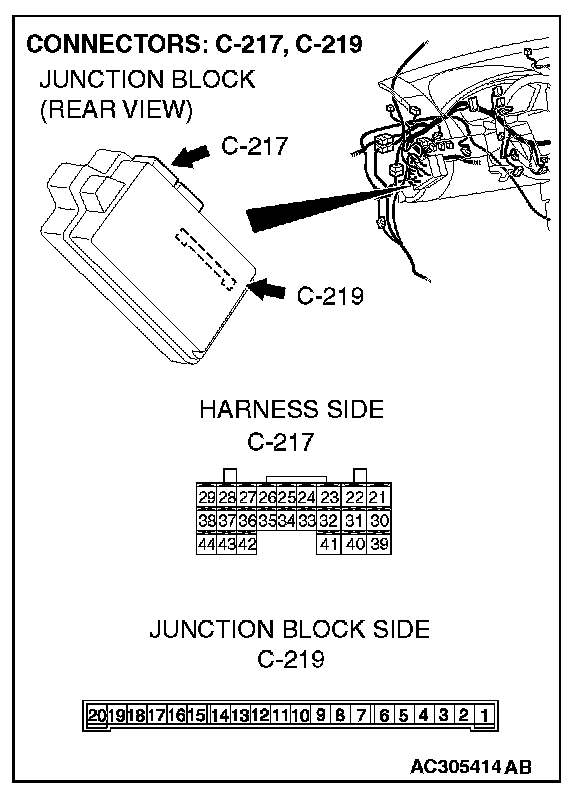 STEP 4. Check ETACS-ECU connectors C-217 and C-219 for loose, corroded or damaged terminals, or terminals pushed back in the connector.