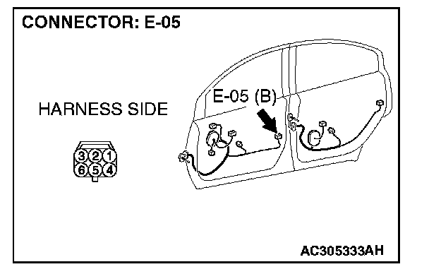 STEP 7. Check front door lock actuator (RH) connector E-05 for loose, corroded or damaged terminals, or terminals pushed back in the connector.