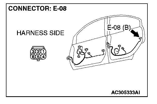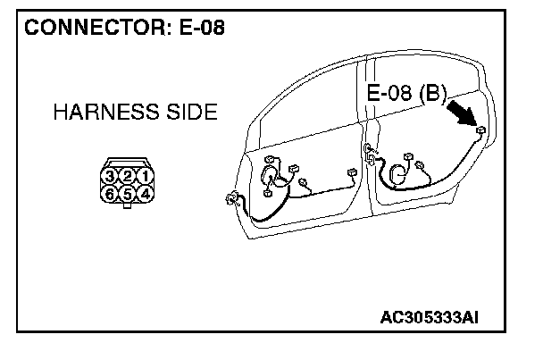 STEP 15. Check rear door lock actuator (RH) connector E-08 for loose, corroded or damaged terminals, or terminals pushed back in the connector.