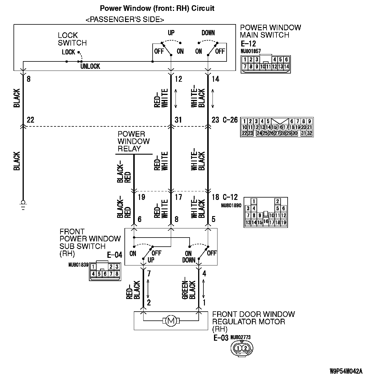 INSPECTION PROCEDURE D-5: Power Window: Front or rear passenger's power windows do not work at all by operating the power window main switch.Power Window (Front: RH) Circuit: