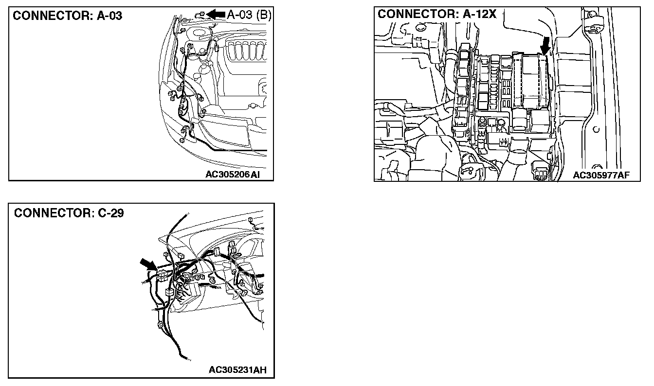 STEP 3. Check windshield wiper motor connector A-03 for loose, corroded or damaged terminals, or terminals pushed back in the connector.