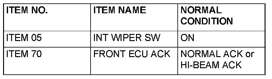 Normal condition is not displayed for the "FRONT ECU ACK" : Replace the front-ECU. Verify that the windshield wiper works normally.