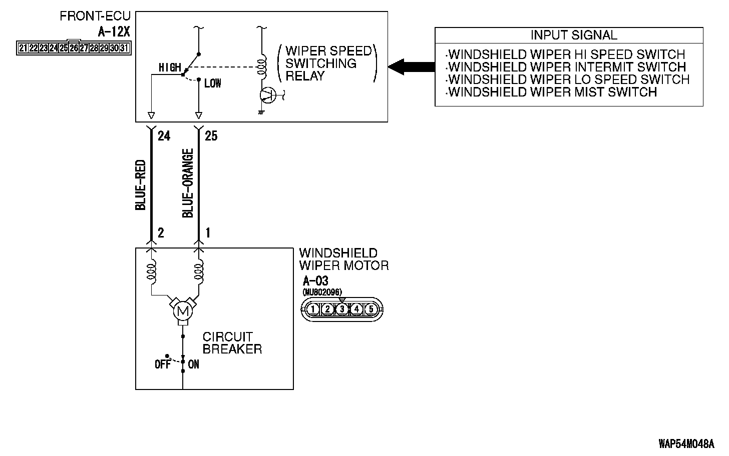 INSPECTION PROCEDURE G-2: Windshield Wiper and Washer: The windshield wipers do not work when the windshield wiper switch is at "INT" or "MIST" position or the windshield washer switch is at "ON" position. However, the wipers work at low speed when the windshield wiper switch is at "LO" or "HI."NOTE: This troubleshooting procedure requires use of scan tool MB991958 and SWS monitor kit MB991813. For details on how to use the SWS monitor, refer to "How to use SWS monitor." How to Use SWS Monitor