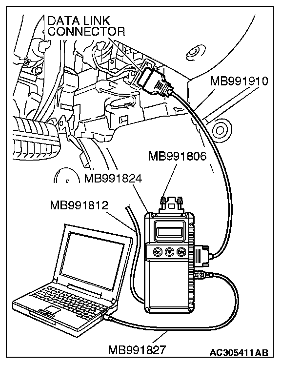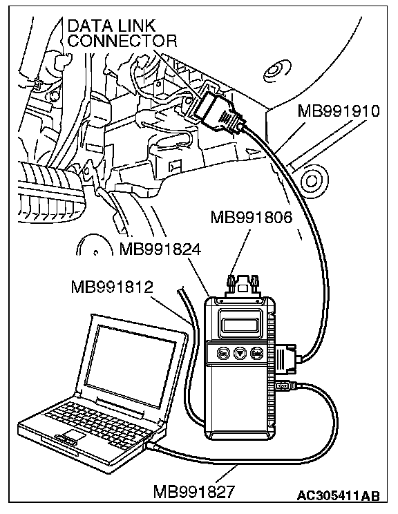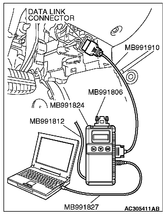 CAUTION: To prevent damage to scan tool MB991958, always turn the ignition switch to the "LOCK" (OFF) position before connecting or disconnecting scan tool MB991958.